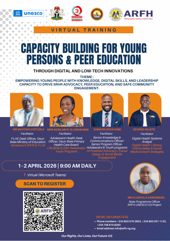 1-2 April 2026 | 9:00 AM daily Virtual via Microsoft Teams ARFH is training young people to become peer educators, digital advocates, and leaders Learn adolescent SRHR & FLHE Gain life skills & GBV awareness Master digital health literacy & online safety Create advocacy content using AI, Canva & social media Scan the QR code […]