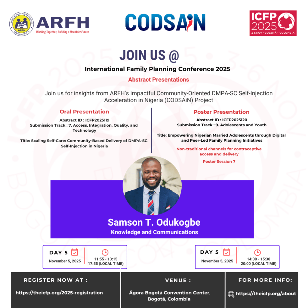 ARFH will participate in the International Conference on Family Planning (ICFP) 2025, scheduled to be held in Bogotá, Colombia. ARFH will be represented by Dr. Kehinde Osinowo the CEO, and Samson Odukogbe. At the conference, Samson will present findings from the Community-Oriented DMPA-SC Self-Injection Acceleration in Nigeria (CODSAiN) Project, supported by the Gates Foundation. As […]